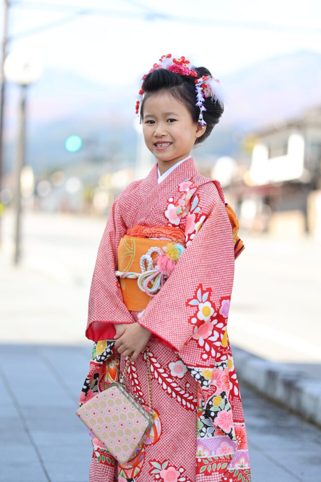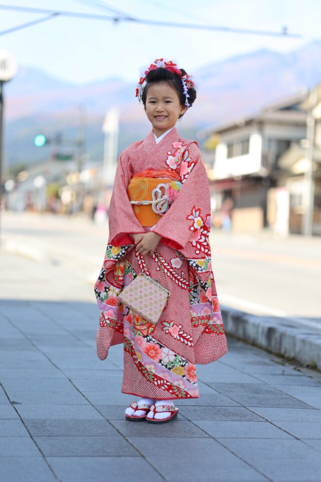• 茜の持つ意味: この赤地の絞り風の着物は、七五三という祝いの場にふさわしい華やかさと品格を兼ね備えています。赤は魔除けの色、そして生命のエネルギーを象徴する、最もおめでたい色です。