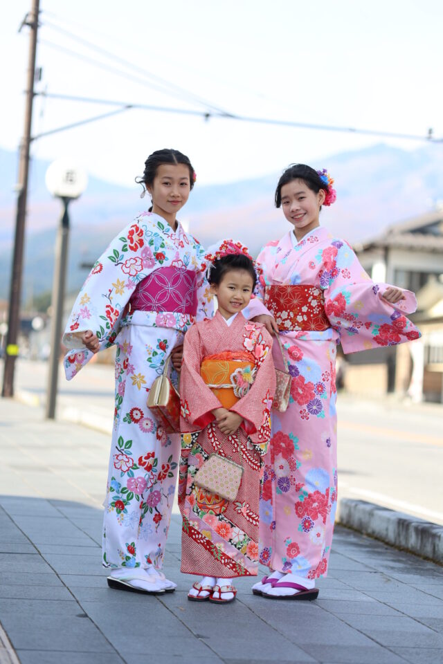 • 調和と相乗効果: 鮮やかな赤地の末娘さまの横に、淡く優しいライトブルーとライトピンクのお姉さま方が並ぶことで、末娘さまの赤が一段と引き立ち、三姉妹の並びがまるで一幅の絵画のように、美しく調和しました。これは、着物が大好きなお姉さま方だからこそできる、深い愛情が込められたコーディネートでした。