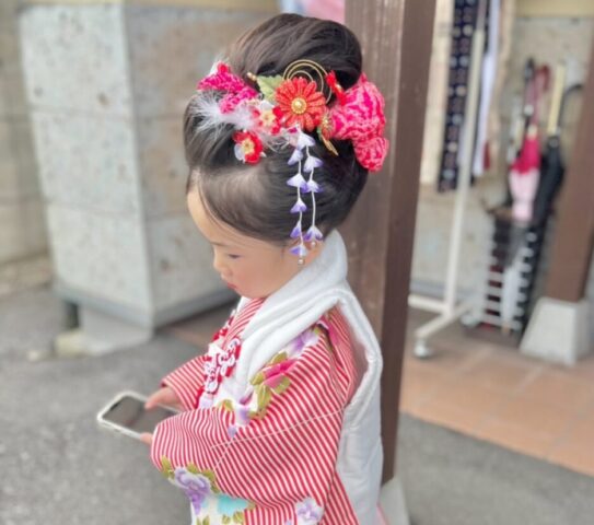 • 高めのカールアップ: 高めでまとめたふわふわアップスタイルは、幼さを残しつつも、凛とした雰囲気でお着物に相性バッチリです。うみちゃんの七五三を、レトロでクラシカルに、そして大人っぽく仕上げたいお嬢さまに特におすすめのスタイルです。