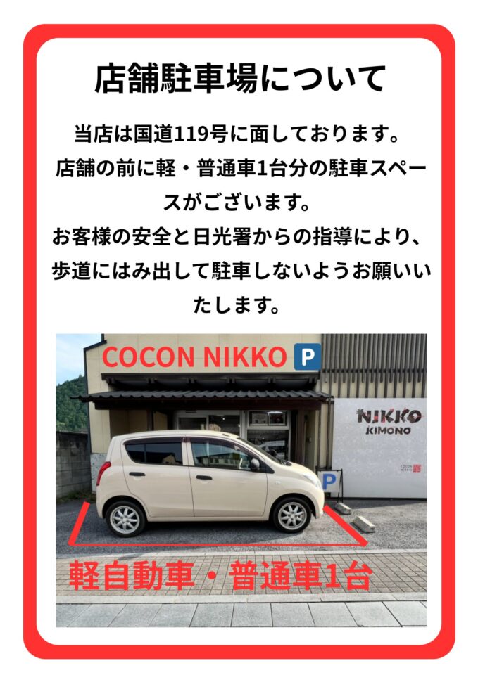 ※COCON NIKKOには専用駐車場はございませんが、近隣にコインパーキングがございます。ご予約時にご案内させていただきますね。