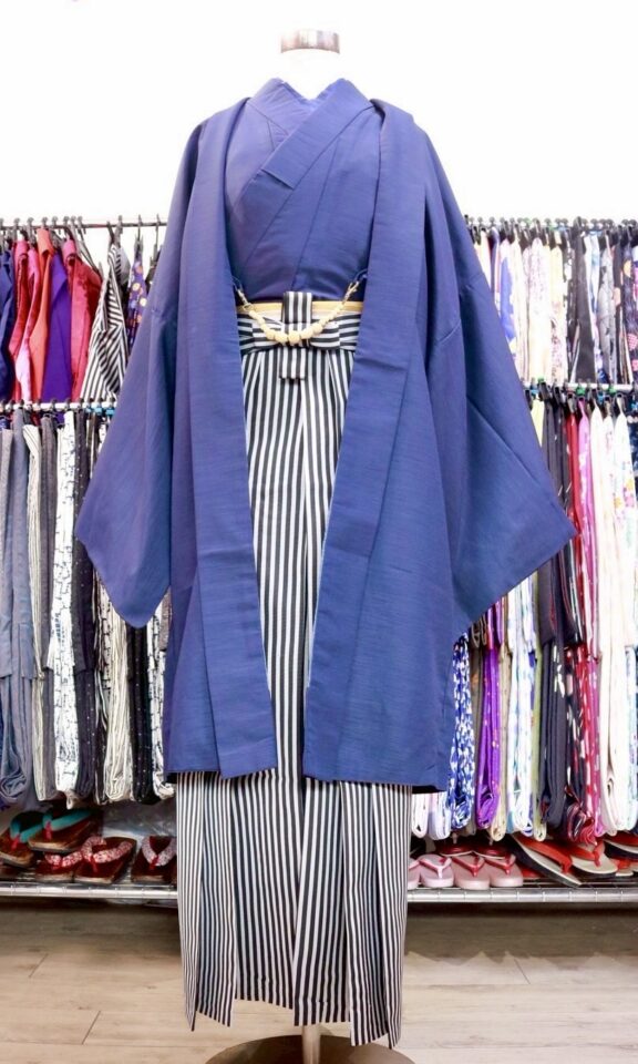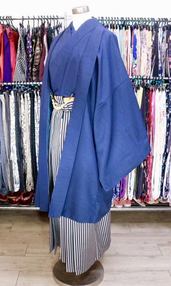 メンズ袴 黒ストライプ袴と紺羽織着物 メンズ着物サイズ 着物 紺 L・3Ⅼ size 170cm ~ 190cm羽織 紺M・L・3L 160㎝~190㎝ 袴 黒ストラップ M・2L ※上記のサイズは目安になります。体型により変わることもございます。